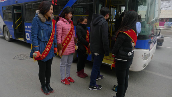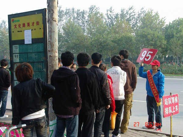 为倡导文明乘车,维护人身安全。正值11月安全月之际,化工食品学院组织志愿者小分队积极配合学校举办的公交站志愿活动,先后开展了多次公交站秩序维护活动。志愿者们来到文化路与英才街公交站牌处,认真清理公交站牌上面的小公告,擦去站牌上面布满的灰尘,使公交站牌焕然一新。同时,志愿者们拿着自制的公交站牌为乘客指明坐车地点,公交车行进方向,极大地方便了乘客乘坐公交车。积极组织乘客排队上车,有序下车,帮助坐车人员拿行李,耐心为坐车人员解答坐车的方向和路线,安全有序,文明乘车,提高了乘车效率。志愿者们热心搀扶老人、孕妇上车,照顾弱势群体,让他们感受到了温暖,使广大乘客们明白:礼貌出行,从我做起,杜绝拥挤,文明乘车。
