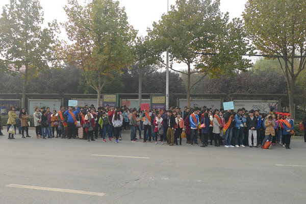2014年11月20日,中州大学外国语学院的青年志愿者们在郑州市文化路英才街公交站台开展“公交文明行”活动。他们在公交车来临之时努力维持公交秩序,成为马路上一道靓丽的风景线。志愿者们戴着小红帽,身着外国语学院院服,手持外国语学院院旗,身披绸带,不惧风寒利用课余时间走上街头,用自己的实际行动及时劝阻、耐心疏导,为构建我市文明城市尽自己的微薄之力。他们用真诚的微笑和耐心的劝告,赢得群众的好评,获得市民的称赞。