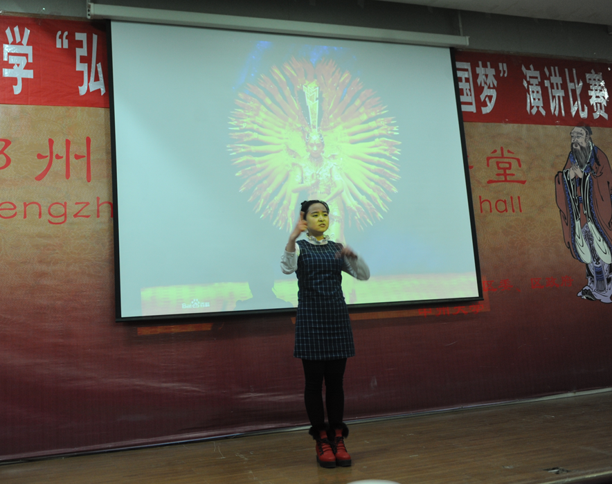 此次活动得到了全校各院的积极配合与响应,各院也分别选派了优秀的参赛选手参赛。从服饰到肢体语言到背景音乐,可以看出选手们的准备都十分充分。最后一位上场的是一位特殊选手,来自特殊教育学院的一名聋生,她用无声语言的魅力为我们带来了“中国梦聋人梦 我的梦”手语演讲,赢得了全场热烈的掌声。经激烈的角逐,文化与传播学院的王天晓、化工食品学院的赵文琪获得本次比赛的一等奖。特殊教育学院聋生张玲玲获得特别奖。文化与传播学院获得本次比赛优秀组织奖。