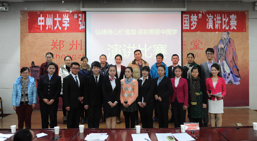 为深入贯彻落实党的十八大、十八届三中全会和习近平总书记“五四讲话”重要精神,促使青年学生深刻认识,大力弘扬社会主义核心价值观,努力实现中华民族伟大复兴梦。2014年12月18日下午6时,由中州大学党委宣传部主办,共青团中州大学委员会协办,中州大学文化与传播学院党总支承办的“弘扬核心价值观?添彩美丽中国梦”演讲比赛在一区一阶八举行。