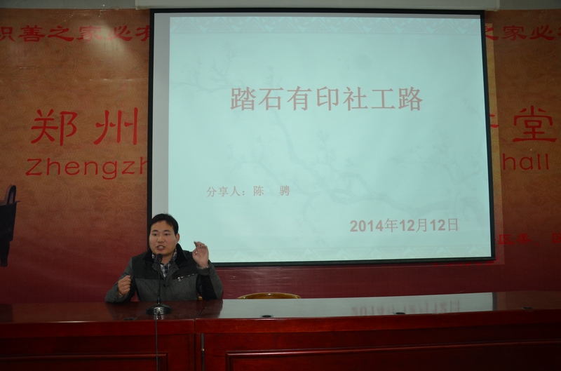 郑州市南阳新村办事处绿城社工党支部书记、站长陈骋,2004年7月毕业于武汉大学法学院社会学系社会工作专业,自从事社工工作以来,凭着自己的努力和汗水,做出了无数的凡人善举,曾获得年度中国十大社工人物、2013感动中原十大年度人物、全国首批社会工作师、第十三届“河南青年五四奖章”获得者、被誉为“中原社工实务第一人”。陈骋站长以“踏石有印社工梦”为话题,与大家分享了他从事工作十年来,为了心中的“社工梦”所做的点点滴滴,并号召大家“有困难做找社工,有时间做义工”。陈站长用他朴实的语言和切身的感受告诉在场的老师和同学们,何谓“道”,什么是“德”,感染了在场的每一位师生。