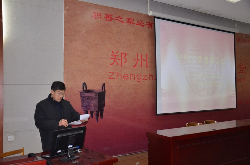 2014年12月23日下午,由中州大学党委宣传部主办,管理学院承办的道德讲堂活动在学生活动中心一区一阶八举行。出席本次活动的嘉宾和领导有:郑州市南阳新村办事处绿城社工党支部书记、站长陈骋,中州大学党委副书记苏炜、校党委宣传部部长张晓梅、管理学院党总支书记刘晓安、副院长王斌。管理学院的师生代表200余人参加了活动。本次活动由管理学院分团委书记张彩虹担任主持,以“社工筑梦、青春践行”为主题。