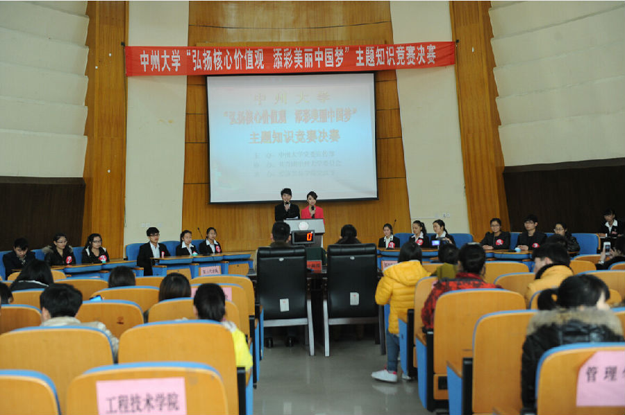 中州大学“弘扬核心价值观,添彩美丽中国梦”主题知识竞赛比赛分为初赛和决赛两个环节。初赛是采用笔试形式进行,经过选拔,有六支参赛队进入决赛。决赛采用现场答题形式,以必答题、抢答题、风险题三轮竞赛决定胜负。比赛过程中,选手们围绕“社会主义核心价值观”、“中国梦”等关键词展开激烈竞争,选手们知识储备丰富,表达流畅,逻辑严谨,表现的十分精彩,赢得了现场观众的阵阵掌声。经过三轮激烈的比赛以及附加赛后,经济贸易学院代表队获得一等奖,工程技术学院代表队、文化与传播学院代表队分获二等奖,信息工程学院代表队、管理学院代表队、外国语学院代表队分获三等奖,经济贸易学院获得优秀组织奖。