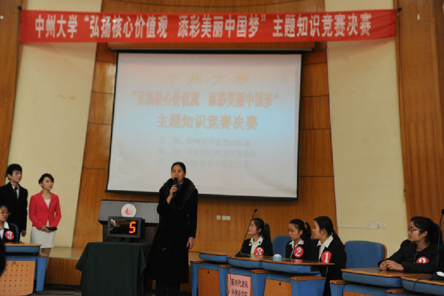 12月19日下午,由中共中州大学党委宣传部主办,共青团中州大学委员会协办,经济贸易学院党总支承办的“弘扬核心价值观,添彩美丽中国梦”主题知识竞赛决赛在学术报告厅举行。校党委副书记苏炜,宣传部部长张晓梅,经济贸易学院党总支书记马林靖、副书记李爱华等领导出席了比赛。校团委书记孙江虹、党委宣传部副部长王伟龙担任了决赛的仲裁。