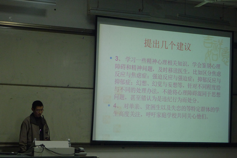 通过这次讲座,同学们加深了对心理健康的认识,增强了心理疾病的预防,掌握了心理调节的方法,为在心理方面构建和谐校园作了一次有益的实践。