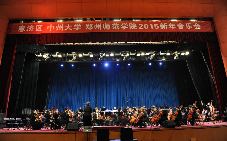 12月28日晚,由惠济区、中州大学、郑州师范学院主办,郑州师范学院歌剧中心承办的“2015新年音乐会”在中州大学学生活动中心举行。39位美国知名演奏家和24位国内优秀演奏家为中州大学和郑州师范学院的师生带来了一场高水平的交响音乐会。惠济区各位领导,惠济区道德模范和文明标兵们,师范学院的校领导和中州大学党委副书记苏炜、副校长李欣、校纪委书记孙学文与师生们一起观看了本次演出。
