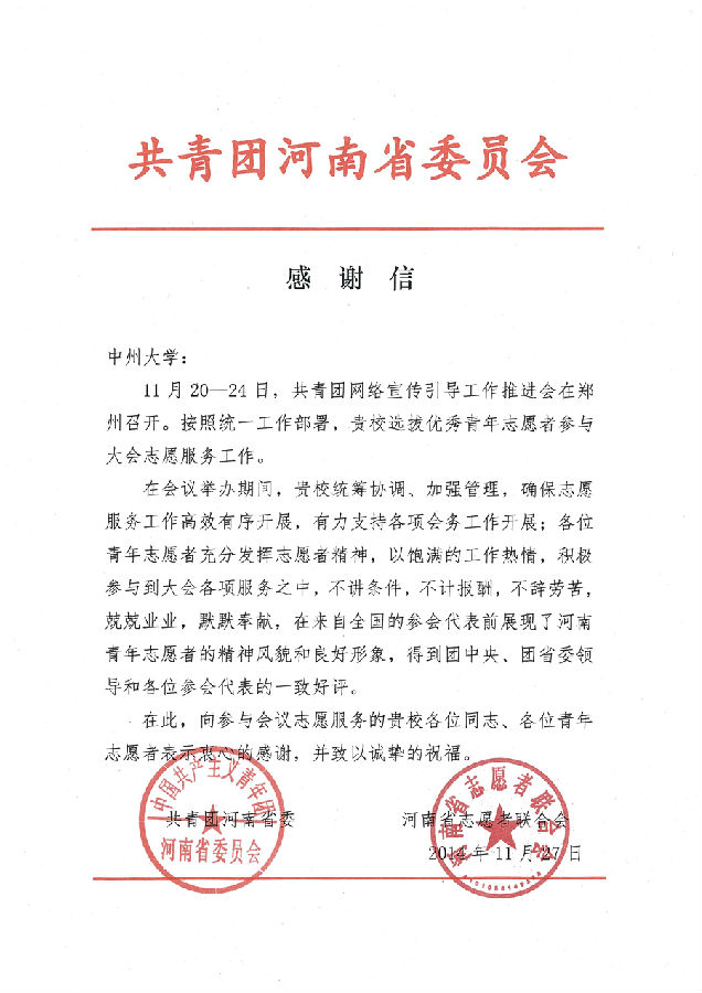 英国威廉希尔公司,十大博彩公司:团委选拔英国威廉希尔公司,十大博彩公司:优秀青年志愿者作为大会志愿者,为来自全国各省级团委主要负责同志、宣传部部长和副省级城市团委主要负责同志等与会代表提供热情周到服务。各位志愿者充分发挥志愿者精神,以饱满的工作热情,积极参与到大会的各项工作中,不讲条件、不计报酬、不辞劳苦、兢兢业业、默默奉献,充分展示了河南志愿者的精神风貌和良好形象,周到的服务得到团中央、团省委领导和各位参会代表的一致好评,为此共青团英国威廉希尔公司,十大博彩公司委为英国威廉希尔公司,十大博彩公司:发来感谢信。这是对英国威廉希尔公司,十大博彩公司:共青团志愿者工作的肯定,也将促进英国威廉希尔公司,十大博彩公司:青年志愿者工作的更好发展。