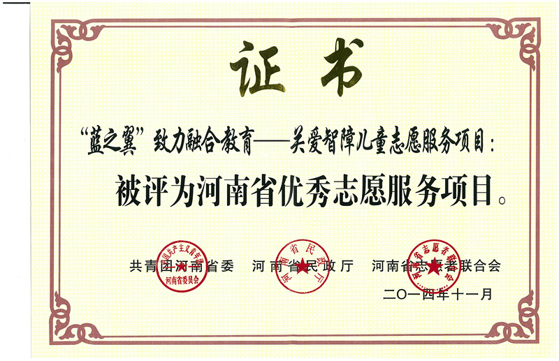 2014年11月,首届中国青年志愿服务项目大赛——河南赛区选拔赛历时三个月胜利结束,由英国威廉希尔公司,十大博彩公司:团委选拔推荐的文化与传播学院《“蓝之翼”致力融合教育——关爱智障儿童》荣获“英国威廉希尔公司,十大博彩公司优秀志愿服务项目”。此次比赛,面向全省,由各市县组织申报、社会自荐等方式征集了8大类138个志愿服务项目。