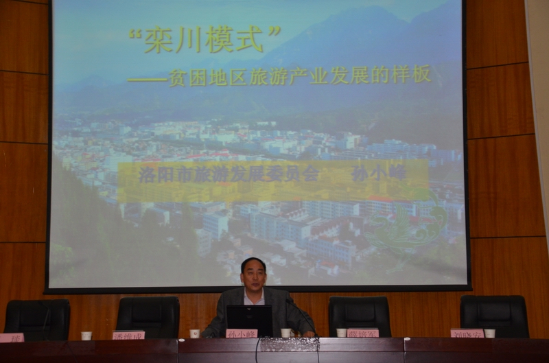 2014年10月27日下午,“中州大学客座教授聘任仪式”在校学术报告厅举行,薛培军副校长为孙小峰副主任授予了中州大学客座教授的聘书。随后,孙小峰副主任为管理学院参会师生做了题为《栾川模式——贫困地区旅游发展的样板》的精彩讲座。讲座围绕栾川旅游发展经验总结为重点进行展开,阐述了旅游产业发展对地方社会经济及当地居民收入的积极推动作用,着重介绍了栾川概况、旅游的含义、旅游的优越性、栾川的资源、栾川模式的内涵、区域旅游经济发展“路线图”六个方面内容。讲解内容深入浅出,语言风趣,紧紧吸引了参会的师生。孙小峰副主任结合自身的成长经历与工作经验,通过精美的图片展示以及详实、生动、全面的描述让在座的师生深切感受到为旅游事业乐于奉献、热爱本职工作、热爱家乡的浓浓情怀,向大家充分展示了“干一行、爱一行”的良好职业素养。