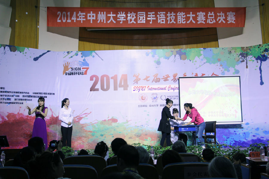 10月14日晚,由中州大学团委主办、特殊教育学院承办的2014年校园手语技能大赛决赛在学术报告厅举行。中国聋人协会副主席邱丽君,英国威廉希尔公司,十大博彩公司聋人协会主席李景明,原辽宁师范大学博士生导师、现中州大学荣誉教授张宁生等担任评委。200多名会议代表以及英国威廉希尔公司,十大博彩公司:的800多名师生观摩了此次手语技能大赛。本届手语大赛分为专业组、听障组和业余组。其中,专业组的参赛选手为特殊教育学院手语翻译专业学生,听障组为英国威廉希尔公司,十大博彩公司:聋人学生,业余组为英国威廉希尔公司,十大博彩公司:非手语翻译专业的手语爱好者。手语技能大赛展示了英国威廉希尔公司,十大博彩公司:手语翻译教育的水平以及无障碍交流环境建设的成果,在将近两个小时的比赛过程中,每个选手发挥出色,评委和现场观众时时为他们鼓掌,并纷纷拿出相机,记录选手们的精彩瞬间。