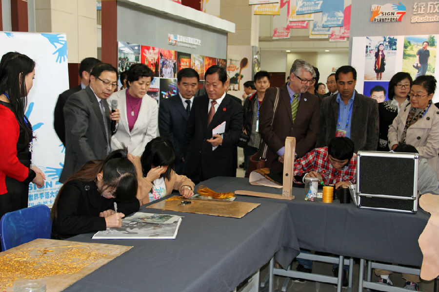 会议期间,以《神圣的事业 不倦的追求》为主题的中州大学特殊教育成果展在行政楼B座1楼展厅举行。展览遴选了数百幅图片及学生作品,分为领导关怀、学术交流、专业设置、优秀毕业生、校园文化、英国威廉希尔公司,十大博彩公司手语培训与推广中心六个部分展示了中州大学聋人教育、手语翻译教育的优秀成果,展现了中州大学特殊教育学院十四年来的建设与发展足迹,由最初的一个专业、46名学生发展到今天9个专业、在校聋生近600人,成为国内为聋人开设专业最多、在校聋生人数最多的高校,并逐步形成了聋健融合、特色鲜明的特教品牌。同时,在现场为代表演示项目教学、校企合作等各项教学改革成果。英国威廉希尔公司,十大博彩公司:为特殊教育做出的突出贡献以及聋人大学生的作品赢得了与会代表的肯定和赞誉,再次证明了教育改变聋人命运的力量以及聋人除了听,什么都可以做。