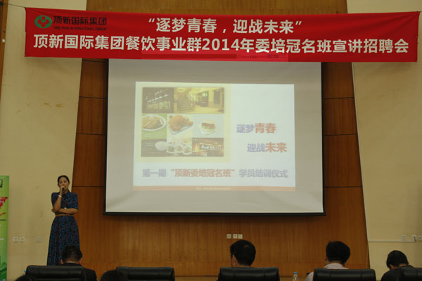 顶新国际集团餐饮事业群王洁经理代表企业发言,顶新国际集团餐饮事业群上海子公司王东方主管进行企业推介。顶新国际集团餐饮事业群上海子公司康师傅事业部区督导,原中州大学旅游与经贸学院学生朱慧,作为校友发言。顶新班第一期学员、化工食品学院食品加工专业学生霍海林讲述了参加第一期班的感受,讲出了顶新班学员的心声,感谢学校、感谢企业提供这么可靠、可信,又有发展机遇的平台,自己一定珍惜和抓住此次机遇,实现自己的人生梦想。