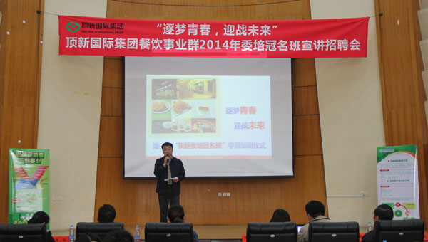 2014年10月18日14时,顶新定向委培冠名班(以下简称顶新班)第二期学员招募在学术报告厅隆重举行。顶新国际集团餐饮事业群王洁经理、上海子公司王东方主管等一行人莅临英国威廉希尔公司,十大博彩公司:。中州大学副校长薛培军教授、就业指导办公室主任郭玮、教务处处长潘维成、文化与传播学院院长张帅旗出席了此次招聘会。