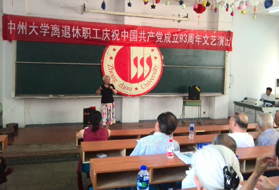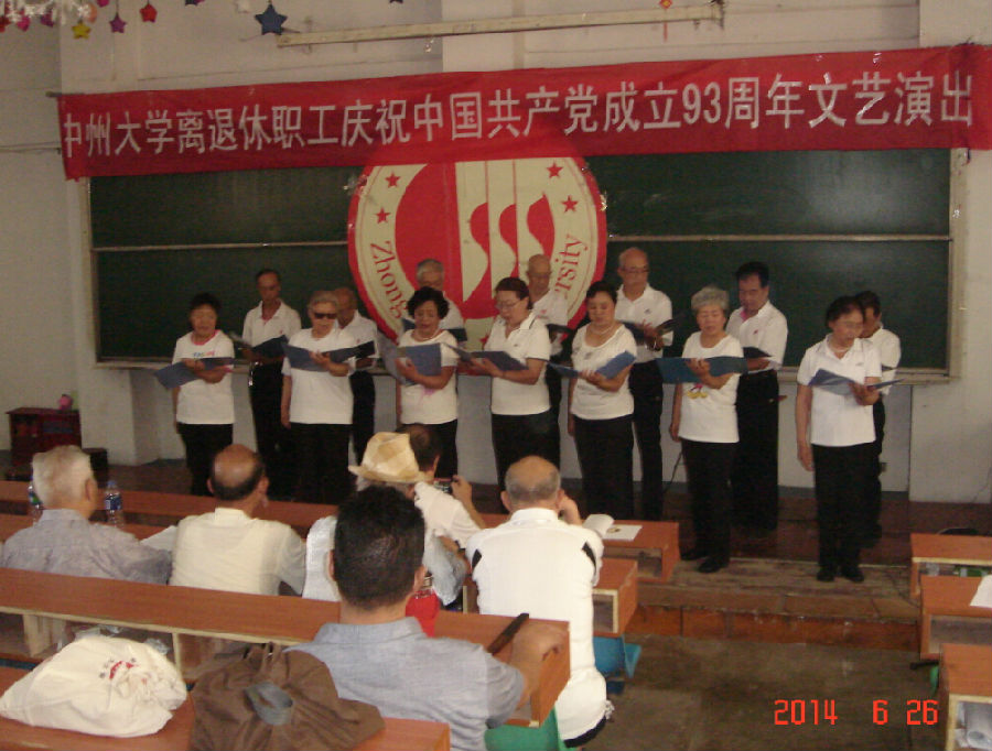 心中的祝福献给党,6月26日下午,南校区阶一教室内花腔嘹亮,乐鼓鸣响,为庆祝中国共产党成立93周年,在离退休职工管理处的精心组织下,全体退休教职员工在此观看了一场精彩的文艺演出。