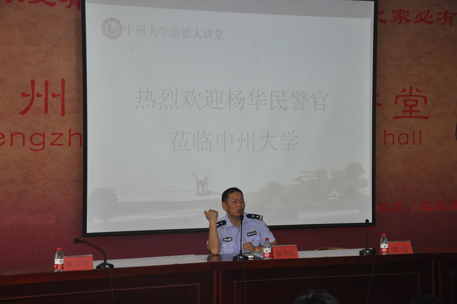 接下来,本次道德讲堂严格按照《郑州市“道德讲堂”活动实施方案》,依次进行自省、唱歌曲、诵经典、学模范、发善心、送吉祥(做承诺)、向“德”鞠躬、一堂一善事等八个流程。本期道德大讲堂在《我相信》的合唱声中拉开帷幕。随后,参加活动的全体师生一起朗诵了《公民道德歌——爱岗敬业篇》,并一起观看了反映杨华民15年如一日爱岗敬业的视频短片。短片结束后,杨华民现身说法,分享了自己对“道”的理解,并以真实生动的例子阐释了“道”所蕴含的三层含义:其一,走好脚下的路。在生活中遵章守纪,看对灯、走对路、站对位,才能为生命安全敞开绿灯;其二,走好人生之路。做工作、干事业要恪尽职守、爱岗敬业,沿正途、走正路;其三,要达到一种思想境界,树立为人民服务的意识。最后,他还以现代版的“大禹治水”、“蚂蚁搬家”等小故事,劝勉同学们遵循循序渐进、水到渠成的发展规律,做事情、干事业从点滴小事做起。