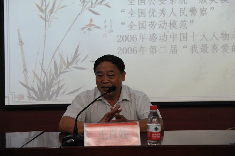 王百姓同志从“把人民的事当作自己的事”,“把人民的困难当作自己的困难”,“对父母一定要尽孝”,“努力学习不断完善自己”,“在奉献中实现自己的价值”等方面讲述了自己如何做一个无私奉献的警察、做一个人民满意的警察、做一个孝顺的儿子、做一个普普通通的好人。王百姓同志先后排除各类炸弹15000多枚,排除爆破装置和哑炮1100多个,他研究的爆破理论和爆破方法,以其独到见解令世界同行对中国防爆界刮目相看;他无数次在危险面前冲锋陷阵,将安全留给他人;他数十年如一日无私帮助老百姓,为他们排忧解难,受到人民群众的广泛爱戴;他不仅孝顺自己的父母,更是帮助教育身边的同志孝敬老人;他坚持只讲奉献,不问索取。讲到动情处,王百姓同志留下了热泪,在场的观众也无不动容。
