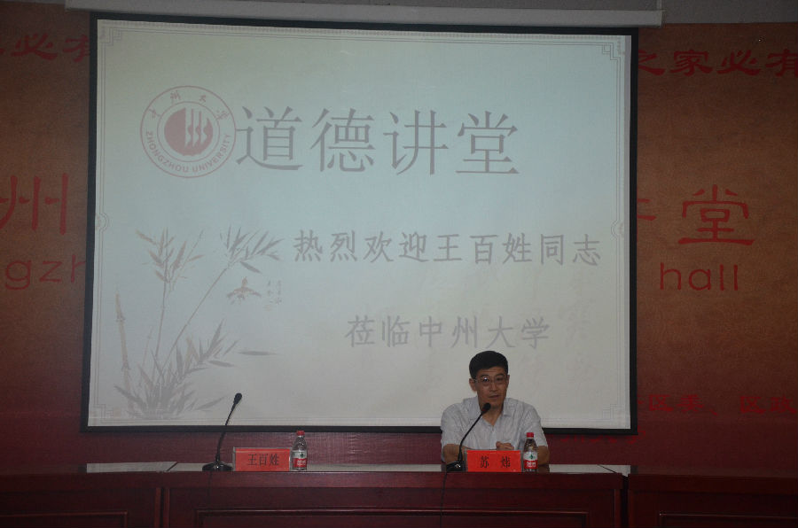 苏炜书记做开讲致辞,向王百姓同志的到来表示由衷感谢。苏书记指出,“道德讲堂”是以“身边人讲述身边事、身边事感动身边人”的形式,引导市民“积小善为大善”、“积小德为大德”的道德传播载体。在“道德讲堂”建设过程中,要严格按照郑州市要求,结合中州大学实际,与社会主义核心价值体系建设相结合,与“中国梦”主题教育实践活动相结合,与党的群众路线教育实践活动相结合,从自身做起,争做道德模范。