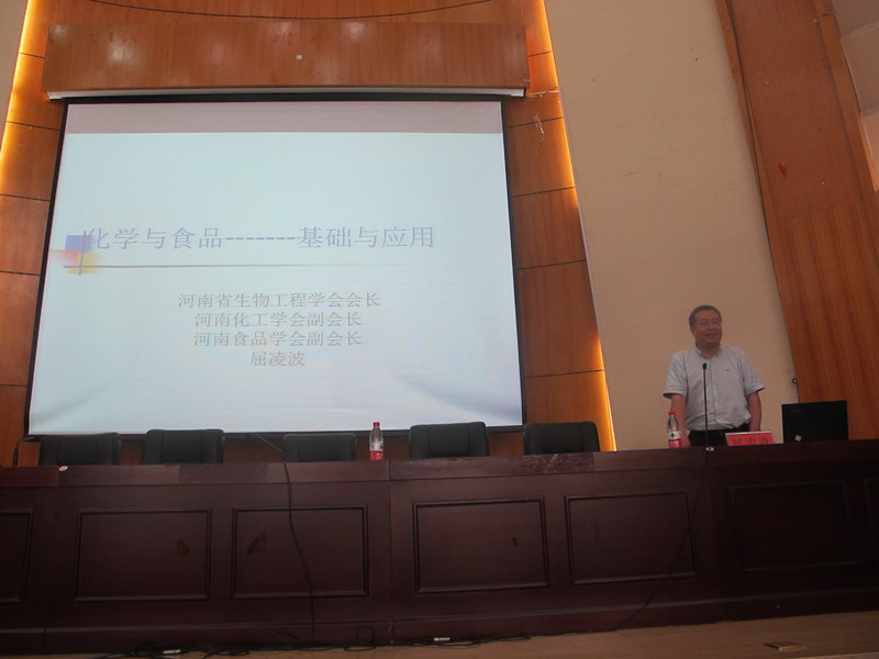 屈凌波教授是国家级百千万人才、国务院政府津贴获得者,多年来一直从事生物化学、药学化学和药物分析等领域的研究工作,在业内享有较高的学术声誉。此次讲座,屈教授结合自己的工作经历,告诫同学们不要惧怕困难,每个人的成功都不会是一帆风顺的;图文并茂的介绍了化学的重要性,化学和生活的重要关系;讲述了食品的化学组成、食品工业的发展趋势、国内食品工业的不足与差距,让同学们对化学有了更深的认识,也让大家知道了学习化学的发展前景。最后屈教授把现代营养学的发展、营养学的新发展、食品安全的概念更详细的讲给大家,把饮食与化学结合在了一起,更有助于同学们的身体健康。