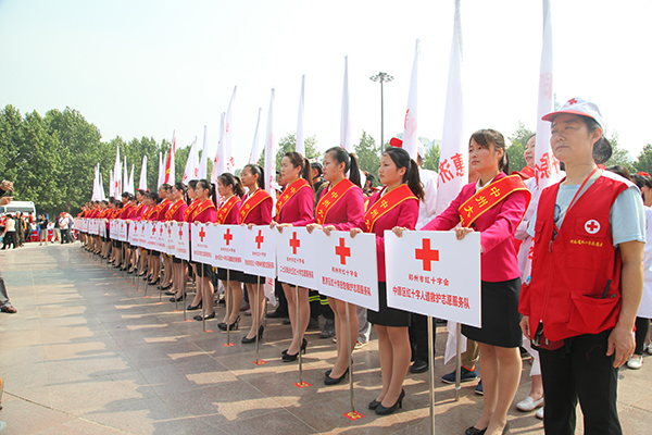 中州大学文化与传播学院的90名志愿者在学院党总支书记刘滨滨和校团委副书记陈洁老师的带领下来到绿城广场参加了此次活动。其中有40名学生志愿者身穿玫红色正装、身带中州大学红十字文化与传播学院志愿者绶带,为本次活动做引导和礼仪工作。郑州市红十字青少年志愿服务总队由中州大学红十字文化与传播学院20名志愿者组成。郑州市人民政府副市长、市红十字会会长刘东等领导在活动期间与中州大学文化与传播学院的志愿者们表示殷切的期望和亲切的慰问,并对中州大学的志愿者给予了充分的肯定。