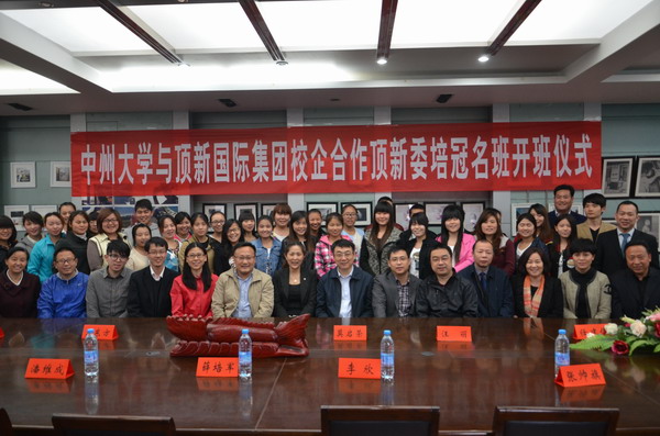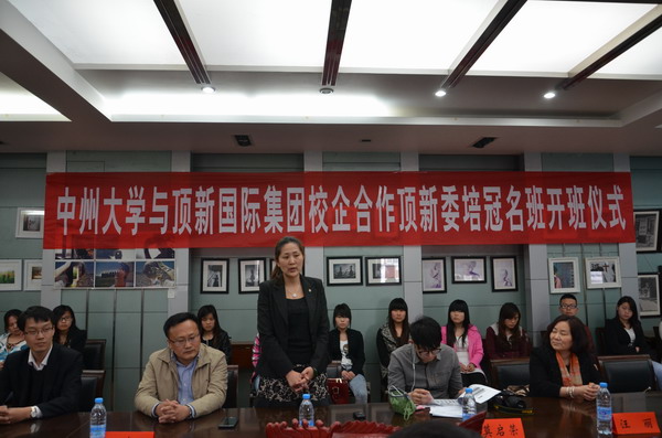 2014年4月11日下午16时,中州大学与顶新国际集团校企合作定向委培冠名班顺利开班。顶新国际集团餐饮事业群人力资源部王洁经理,康师傅训练部陈其昌经理、王东方主管,人力资源部谢春林专员、莫启荣专员莅临开班仪式;中州大学副校长薛培军、副校长李欣、教务处处长潘维成、经济贸易学院院长仲岩、管理学院党总支书记刘晓安、文化与传播学院党总支书记刘滨滨、院长张帅旗、大学生就业指导服务中心副主任王景丽等参加并出席了开班仪式。仪式由中州大学副校长李欣主持。