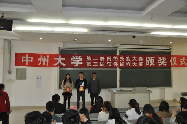 3月27日中午12:30时,信息工程学院在四阶二教室举行专业技能大赛颁奖仪式,对在中州大学第二届计算机网络技能竞赛和第三届软件编程大赛中的获奖选手进行表彰。信息工程学院党总支书记王浩川、院长苏玉、党总支副书记解浩、副院长杨志宏及信息工程学院的部分教师和同学参加了本次颁奖仪式。