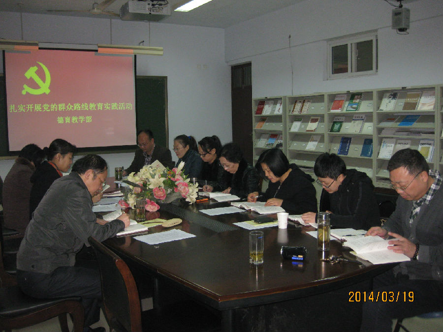 德育教学部党总支要求党员教师,一定要严格按照学校的统一部署,认真学习有关文件,认真抓好教育实践活动三个环节;虚心听取群众意见,分析查摆并解决在“四风”等方面存在的问题,抓好作风建设;加强整改,取得成效,要通过开展教育实践活动,强化党员干部的宗旨意识,履行职责,牢固树立为民、务实、清廉形象。广大党员教师纷纷表示,作为思想政治理论课教师,在教育实践活动中,一方面应将教育实践活动的文件学习与增强政治理论课教学的实效性密切结合起来,另一方面,应将教育实践活动的要求、目的和措施及时融入课堂,引导学生党员更加坚定理想信念,增强对党和政府的信任和信心。