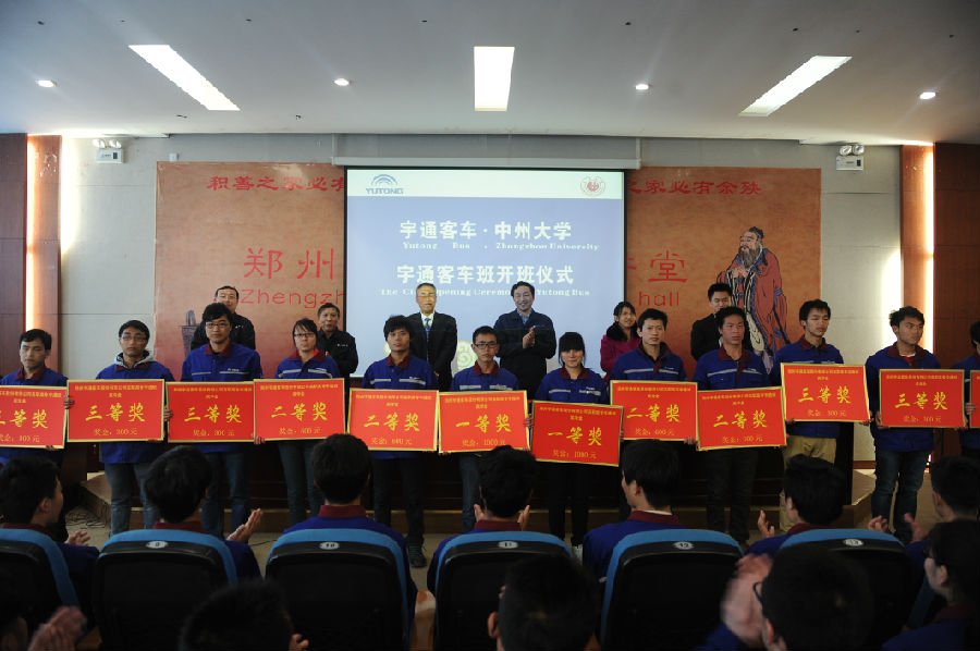 在全体师生的热烈掌声下,到会领导首先为第一届宇通班获奖同学颁发了奖学金和荣誉证书。仪式上,王锋对第一届宇通班学员的学习和工作情况进行了肯定,对同学们在工作中表现出来的勤奋学习、积极实践、勇于担当、锐意进取的精神表示赞赏;向第二届宇通班同学介绍了公司的现状、发展前景等,对他们提出了殷切期望。李九宏院长代表学院表达了与宇通公司继续合作的良好愿望与信心,希望在“宇通客车班”举办的工程中,双方共同努力,在发展中不断进步,成为校企合作共育人才的典范;并对第二届宇通班学员提出了几点希望和要求。