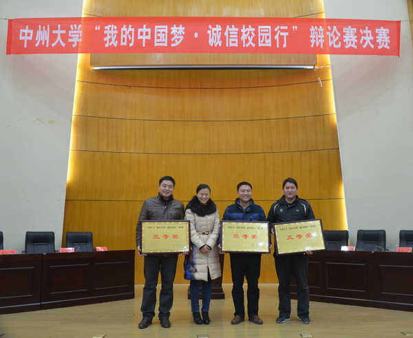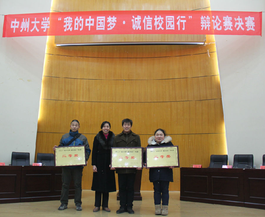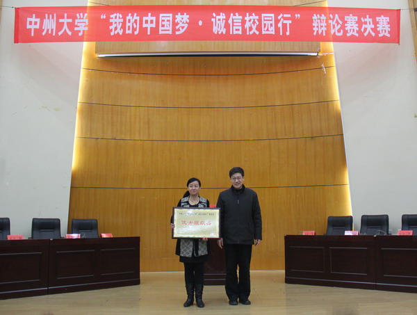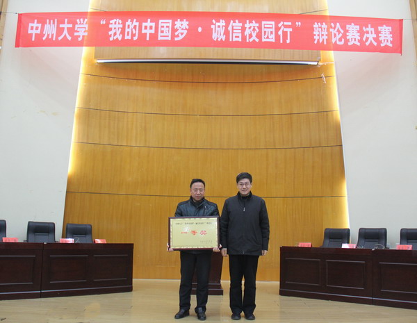 2013年12月23日,由中州大学学生处主办,共青团中州大学委员会协办,文化与传播学院承办的中州大学“我的中国梦 诚信校园行"主题辩论赛决赛在学术报告厅隆重举行。中州大学党委副书记苏炜出席比赛,中州大学党委宣传部部长张晓梅、图书馆馆长郑彦离、机关党总支书记张阳、学生处处长孔颖、团委书记孙江虹担任此次比赛评委。文化与传播学院党总支书记刘滨滨、院长张帅旗,学生处副处长张迎松,文化与传播学院副院长于书伟及各学院师生代表参加辩论赛。