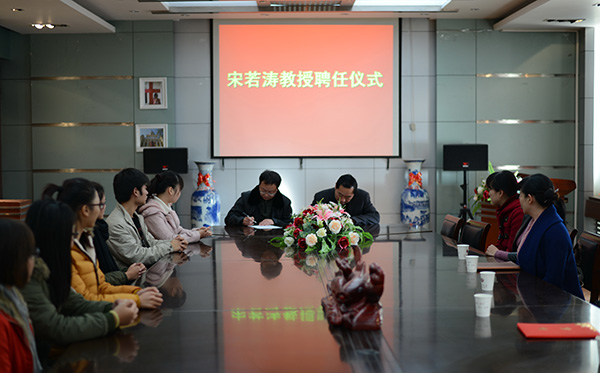 张院长宣布了学校的聘任决定,并介绍了宋教授的基本情况。司校长与宋教授签定了聘任合同,并颁发了聘书。司校长对宋教授表示了欢迎和感谢,并提出了期望,希望宋教授对文化与传播学院的专业建设和师资队伍培养及教科研予以大力支持与指导;宋教授对学校的聘任表示感谢,并表示,会己所能,在文化与传播学院的专业建设等方面给予最大的支持。