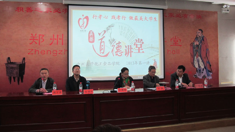 2013年10月28日上午八时30分,由校党委宣传部主办、化工食品学院学院承办的“行孝心,践孝行,做最美大学生”--中州大学本学期第三期道德讲堂开课仪式在学生活动中心一区一阶八举行。学校特别邀请了中州大学教授、2010年中国“十大慈孝人物”许挺为道德讲堂宣讲员。化工食品学院院长李靖靖、党委宣传部副部长王伟龙、化工食品学院副院长岳福兴出席本次活动。学院分团委、学工办老师和300余名学生参加了活动。活动由学院党总支副书记周万春主持。