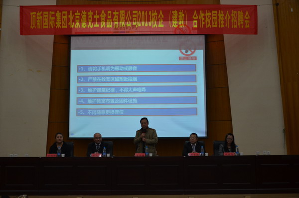 2013年11月1日14时,顶新国际集团北京德克士食品有限公司2013建教(校企)合作校园推介招聘会在中州大学学术报告厅隆重举行。顶新国际集团北京德克士食品有限公司主管崔凯军、管理处副理周京义、营运处人事行政组科长汪丽萍、中州大学文化与传播学院院长张帅旗和学院全体老师出席了此会议。