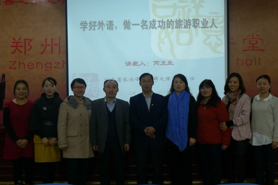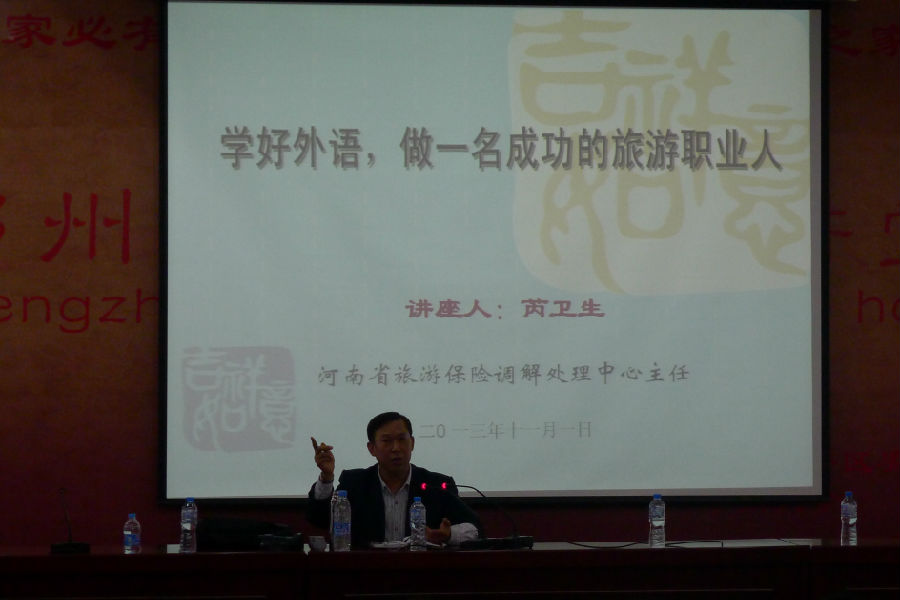 芮主任首先介绍了河南旅游业及导游发展的现状,指出中原经济区建设尤其郑州航空港的建设将极大促进河南旅游业的发展,因此培养优秀的旅游英语从业人员的任务迫在眉睫。其次,芮主任就导游必备素质以及如何做好导游发表了自己的见解。他提出,好导游必须具备足够的语言能力,渊博的历史文化知识,较高的政治觉悟以及独立的执行任务能力,除此之外还必须拥有健康的身体和心理素质。最后,芮主任结合自己近30年的涉外导游从业经历,讲述了自己在工作过程中遇到的突出问题。解决方案及自己的心得体会,强调过硬的英语语言基本功是做好涉外导游的关键,并向大家传授了自己学习英语语言的秘诀。讲座结束后,专业们学生仍觉意犹未尽,争相向芮主任提出有关在校期间英语学习以及旅游行业方面的问题和疑惑,芮主任认真耐心地逐一解答。
