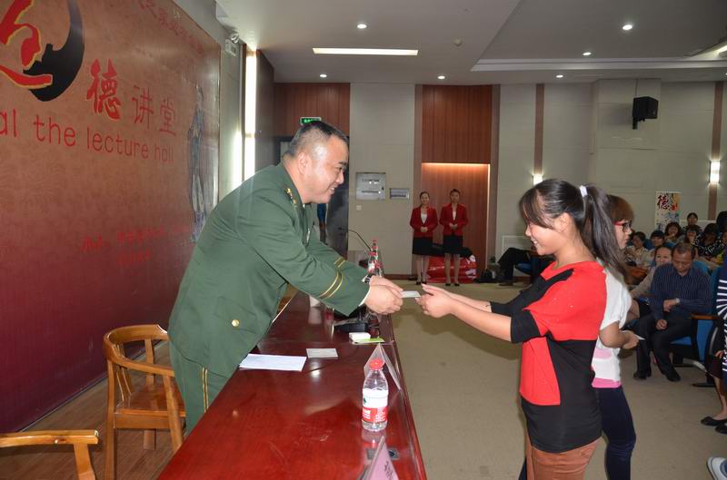 管理学院党总支书记刘晓安代表学院师生对冀新政委的精彩报告表示感谢,并号召全院师生,学习身边的道德模范,从小事做起,积善成德,“勿以善小而不为,勿以恶小而为之”,做一个对社会有用的人。随后,冀新政委和学生代表互赠“吉祥贺卡”,表达双方美好的祝愿和祝福。