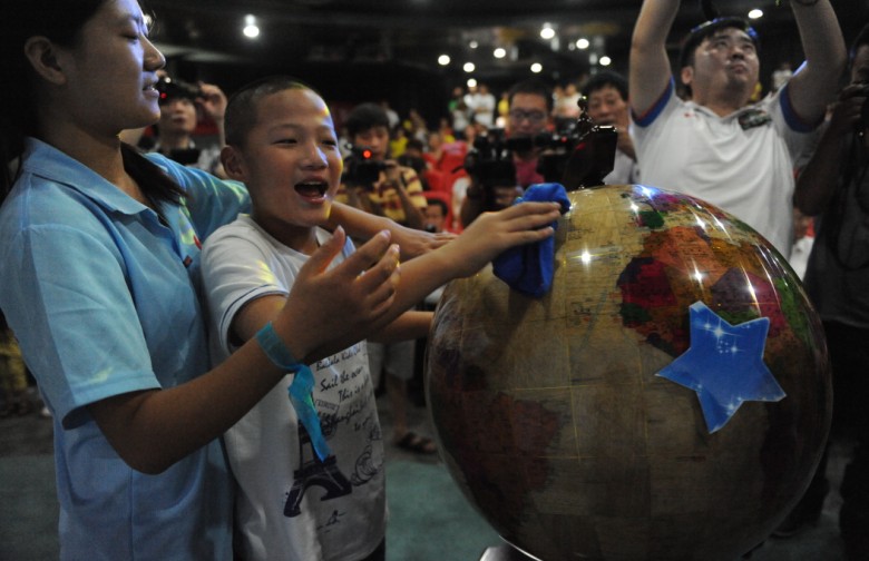 志愿者和“小雨人“用自制环保小手绢共同打扫美丽的“地球”,并在地球上贴上小星星