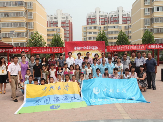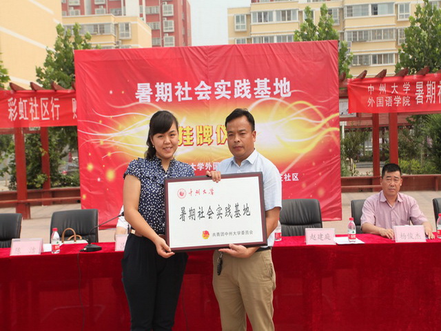 7月17日上午10时,中州大学暑期社会实践基地挂牌及外国语学院赠书仪式在郑州市郑东新区龙子湖街道办事处夏庄社区隆重举行。参加活动的嘉宾有:中州大学外国语学院党总支书记吕志红、中州大学校团委副书记陈洁、郑东新区龙子湖街道办事处党工委书记王培胜、郑东新区龙子湖街道办事处党工委副书记杨俊杰、郑东新区人事劳动局劳动保障中心主任刘晨光、郑东新区计划财政局非税收入管理中心副主任樊高林、郑东新区计划财政局投资评审中心副主任翟云霞、郑东新区人事劳动局劳动保障监察大队副队长王新、郑东新区龙子湖街道办事处劳动就业保障所所长张琳、夏庄社区党支部书记夏小广、夏庄社区居委会主任王根山。
