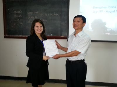 此次培训旨在提升学员英语听力、英语口语交流、英语写作等基本能力,能进行日常工作、生活的英语沟通交流,以适应下一步出国进行专业技术培训的英语环境。郑州市第九人民医院副院长李玲致开场辞,美国约翰霍普金斯大学公共卫生专业学生Angela Roller(骆安琪)作为培训指导教师做了成果汇报;最后,卫生局副调研员虞继亮向骆安琪颁发了卫生国际交流实习鉴定书,并发表了重要讲话。