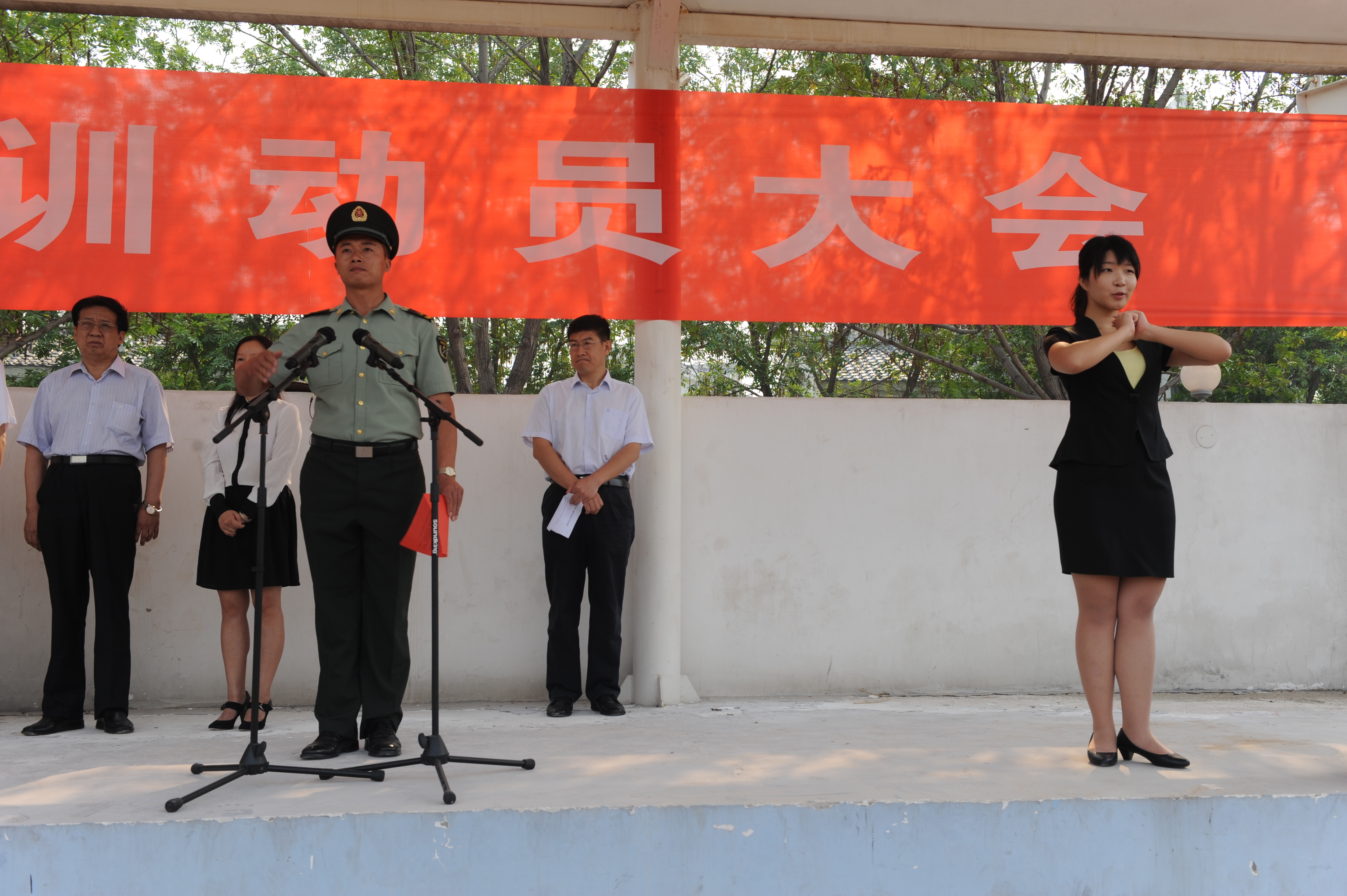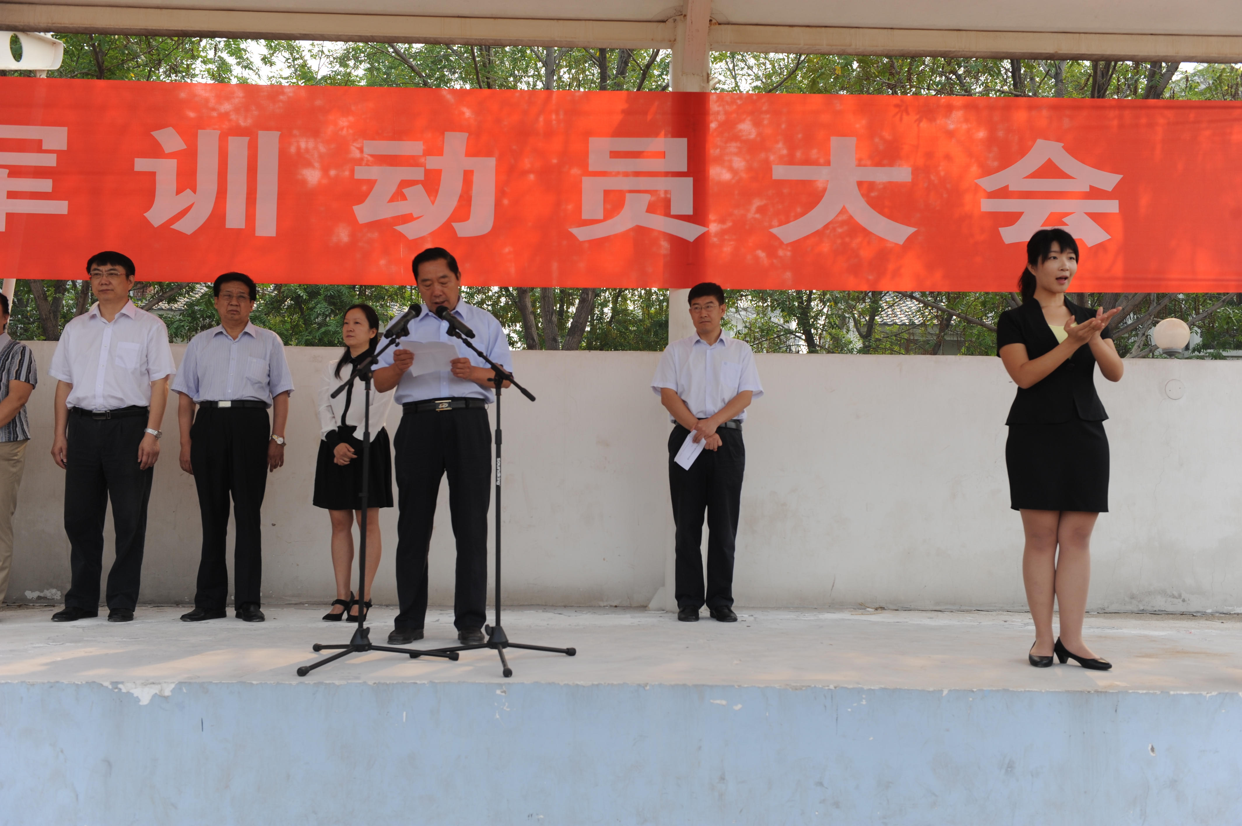 伴随着庄严的国歌声,鲜艳的五星红旗冉冉升起,2013级新生军训动员大会拉开了帷幕。校长司福亭首先做军训动员,他代表学校党政领导以及全体师生员工向2013级新生表示热烈的欢迎和诚挚的祝贺,并向承担此次军训任务的领导和官兵表示衷心的感谢和崇高的敬意。他希望同学们通过军训,提高思想认识,增强国防观念,磨练意志,增强体质。司校长代表学校党委和行政提出三点要求:一、各院领导和职能部门要高度重视军训工作,认真做好组织、协调和军训工作。二、参加军训的同学们要尊重教官,虚心学习他们好思想、好传统、好作风,严格遵守纪律,服从命令,一切行动听指挥。三、希望部队承训教官严格要求,科学组训,圆满完成军训任务。承训教官代表在发言中表示:训练中一定会科学筹划、严密组织;以身作则、争当表率;严守规定、恪尽职守。文化与传播学院2013级播音主持专业学生李钠瑞代表全体军训新生承诺:军训中服从命令,听从指挥,不怕困难,坚决完成军训任务。