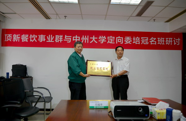 2013年6月4日,中州大学就业实习基地挂牌仪式暨顶新冠名班研讨会在顶新国际集团餐饮事业群上海总部顺利召开。顶新国际集团餐饮事业群开发本部谷尚武副总、董事长室左克林协理、教育训练部倪志敏处长、人力资源部王洁副理、谢春林专员、康师傅事业部训练部王美琴副处长、德克士事业部训练部李晴专员、北京子公司管理处周京义副 理、人事行政组汪丽萍科长、康亚丽专员,中州大学校长司福亭、教务处处长潘维成、就业服务指导中心主任郭玮、文化与传播学院党总支书记刘滨滨、张帅旗院长出席此次实习就业基地挂牌仪式。顶新国际集团北京德克士食品有限公司与中州大学进行校企合作在中国高校当中属于首家,探索与高校合作是顶新国际集团北京子 公司招工和储备干部的新模式。此次在顶新餐饮事业群上海总部进行就业实习基地挂牌仪式暨顶新班冠名研讨会具有标志性的意义,意味着中州大学与顶新国际集团的合作又上升了一个新台阶。