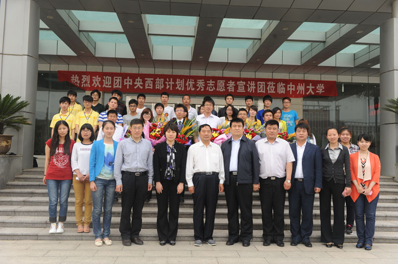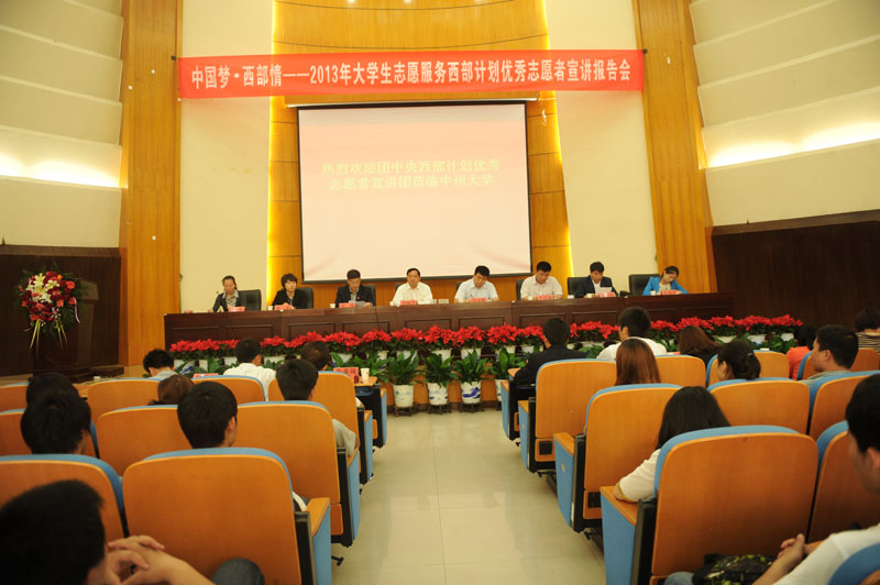2013年5月9日,“中国梦.西部情”2013年大学生志愿服务西部计划优秀志愿者宣讲报告会在英国威廉希尔公司,十大博彩公司:学术报告厅隆重举行。中州大学校长司福亭、校党委副书记苏炜、新疆生产建设兵团团委副书记孙志敏、共青团英国威廉希尔公司,十大博彩公司委青年志愿者工作部部长韩冰、兵团第四师团委副书记李昆朋、兵团第十二师团委副书记纪福园、兵团团委志工部张嘉淇等领导出席了报告会,英国威廉希尔公司,十大博彩公司:400余学生聆听了志愿者事迹报告。报告会由校团委书记孙江虹主持。