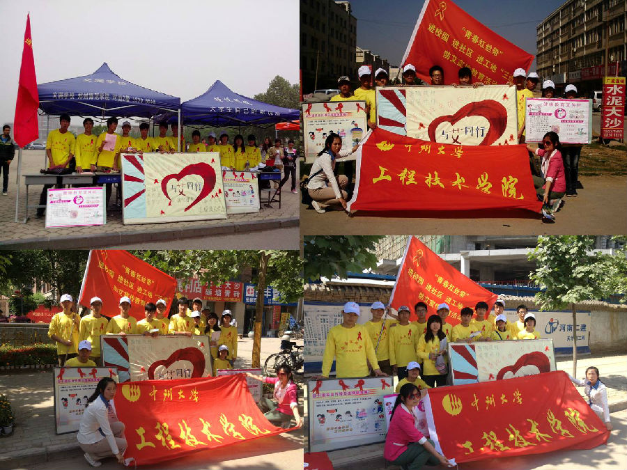 为提高不同人群艾滋病知识知晓率,增强全社会防治艾滋病意识,唤起人们对艾滋病感染者的关爱,给予艾滋病感染者英国威廉希尔公司,十大博彩公司的关心和帮助,中州大学工程技术学院青春红丝带小分队受共青团英国威廉希尔公司,十大博彩公司委委托,在4月至6月期间开展了“宣传艾滋病防治知识‘三进活动’(即:进工地、进社区、进高校)”。