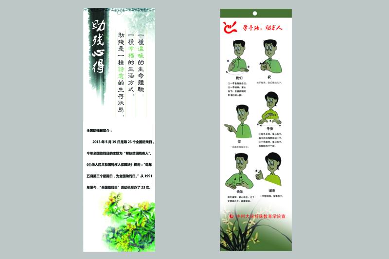 与此同时,为营造健康和谐的助残氛围,构建聋健融合的校园文明环境,特殊教育学院还在校园内举行了形式多样的与扶残助残相关的宣传活动,向广大师生发放了由聋生设计制作的宣传书签。这些活动的开展增强了师生们对聋人、聋文化的了解和认识,提高了师生们学习手语的兴趣和热情,拉近了聋健之间的距离,推进了无障碍环境的构建。