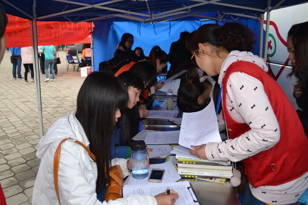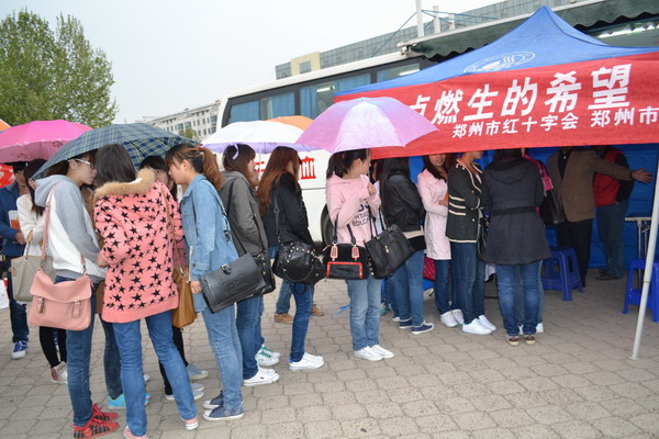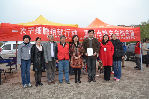 2013年4月19日8:00—12:00,由郑州市管城回族区红字会组织,文化与传播学院承接的造血干细胞捐献志愿者募集工作在中州大学南门口校广场顺利进行。郑州市红十字会韩孝坤副会长、管城回族区红十字会常务副会长姚琳、副会长李桂艳,文化与传播学院党总支书记刘滨滨、院长张帅旗以及相关老师出席了此次活动。