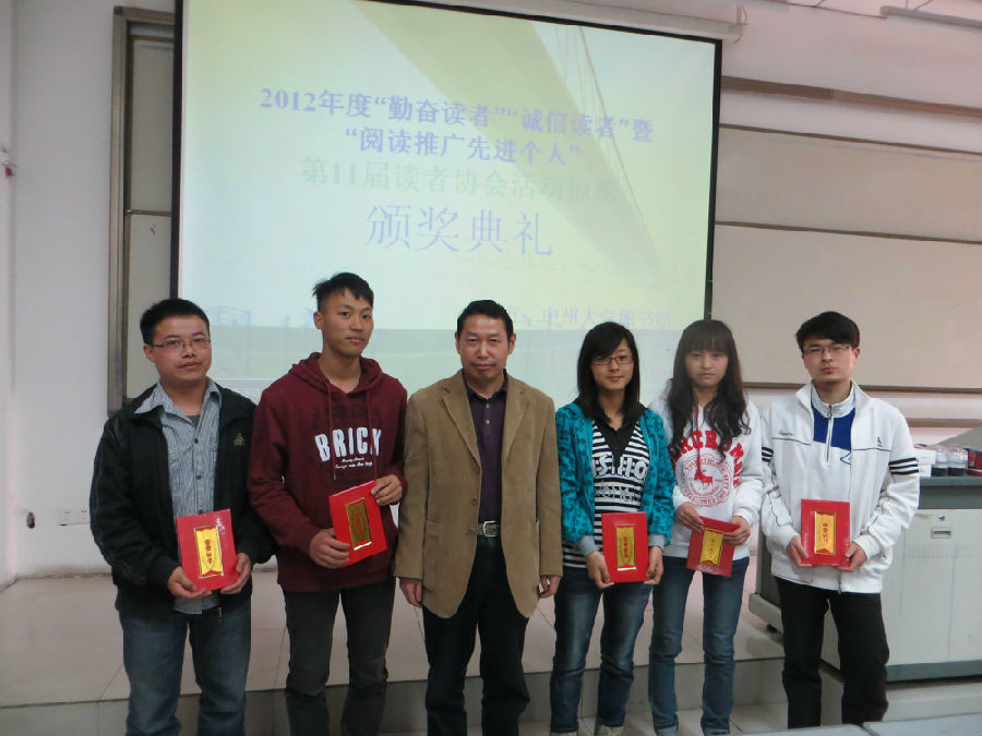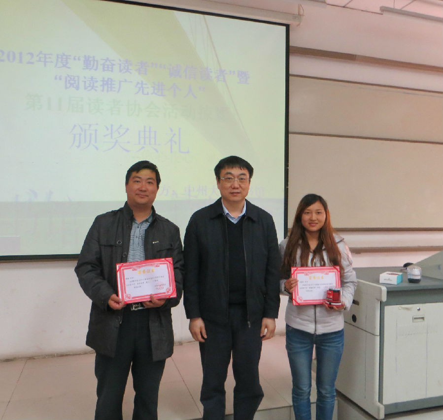 “勤奋读者”是2012年度图书借阅量排名前六的读者,分别设立一等奖两名(教工、学生各1名)、二等奖四名(教工、学生各2名)、三等奖五名(教工2、学生3名),“诚信读者”是借阅量既多又没有违约记录的读者,教师获得者5名,学生获得者10名。另外,还在读者协会成员之间评出了六名“阅读推广先进个人”,以表彰他们在图书馆与读者之间起到的桥梁沟通作用。图书馆举办这次表彰活动,旨在营造浓厚的校园学习氛围,倡导读书明理、读书求知、读书成才的良好风尚,同时弘扬自律守规光荣的意识。