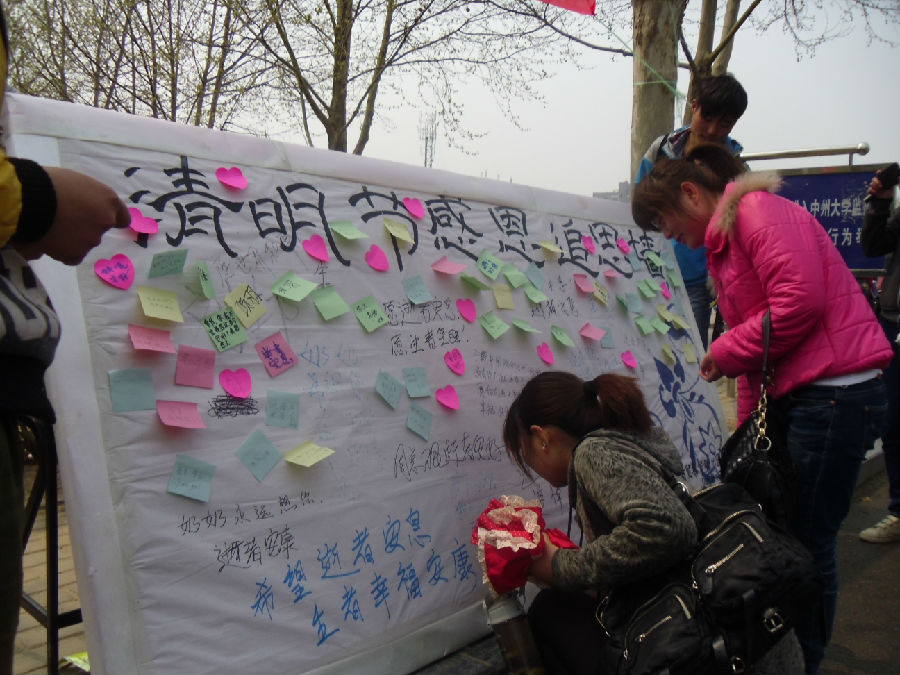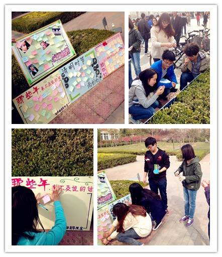国际教育学院举办“清明节寄思”主题活动在“清明节”即将到来之际,为进一步营造绿色、平安、和谐的校园氛围,国际教育学院举办了“清明节寄思”主题活动。学院制作了“那些年,来不及说的话”、“清明时节雨纷纷”、“我们想说的话”等主题展板,号召同学在展板上留言,表达了对烈士、已故亲人、朋友、偶像的思念,抒发自己的情怀。通过开展清明节寄思活动,同学们传承了故人的优秀品德,将之融入自身的品行修养当中。同时增强了同学们的文明的意识,营造起了勤俭节约、环保绿色、平安和谐的浓厚氛围,切实增进了现代学生爱国、爱党、爱校、爱家的情感。