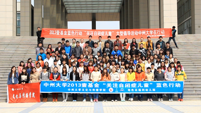 2013壹基金蓝色行动“关注自闭症儿童”大型倡导活动由深圳壹基金公益基金会、大福自闭症关爱基金发起,郑州市管城区委、红十字会和奇色花福利幼儿园等多家单位主办,中州大学文化与传播学院参与组织和策划的系列活动,中州大学师生热情积极地参与了此次活动。